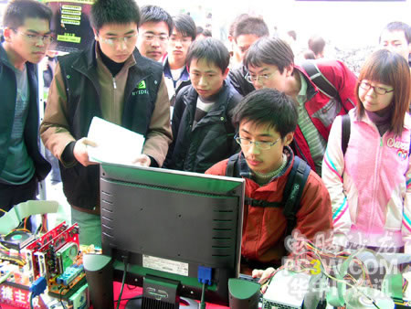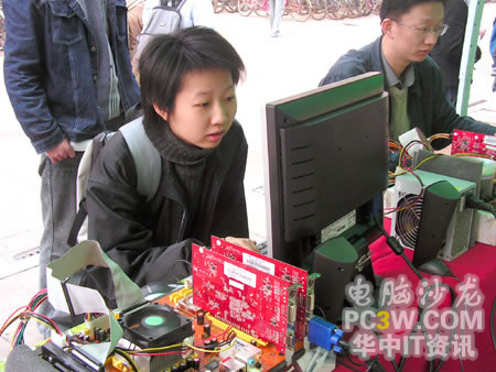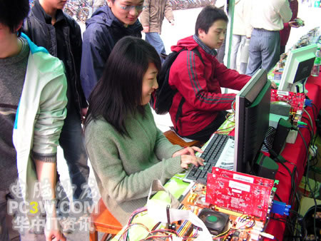 第一個(gè)進(jìn)行SLI平臺(tái)體驗(yàn)的竟然是一位MM,果然是巾幗不讓須眉啊。看她熟練的玩著極品飛車(chē)地下狂飆2,小編也不由感慨,這里不愧是華中地區(qū)最好的理工科學(xué)府啊,果真的臥虎藏龍。