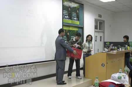三位成績(jī)優(yōu)異的同學(xué)高興的結(jié)果了這次趣味比賽的獎(jiǎng)品——正版游戲軟件、光電鼠標(biāo)以及DVD刻錄盤(pán)片。