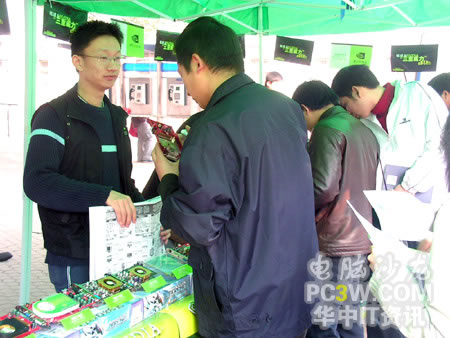 作為NVIDIA從去年來就大力推廣的SLI技術自然是最能吸引大家注意的,不少同學都對這種雙卡并聯技術產生了濃厚的興趣。工作人員也對SLI的一些具體細節進行了詳實而周到的解釋。