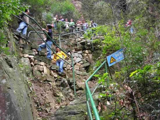 柘林瀑前美女倚架,后面的帥哥看過來。