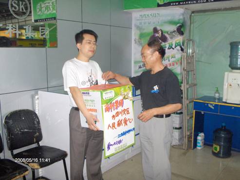 1、一方有難八方支援一直是中華民族優良的傳統,天災無情人有情,在我們的兄弟姐妹正在受到災難折磨的時候,作為一個有良知的中國人,我們是不是更應該拿出自己的一片愛心,有人的出人,有力的出力,用我們的愛心來支援一下災區的同胞們?江西商科電腦公司吳暉經理率先向災區進行了愛心捐款。