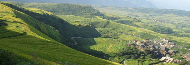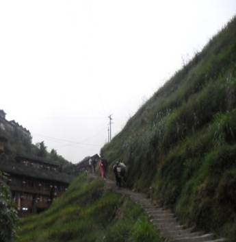 龍脊梯田區域內最高海拔880米,最低海拔380米,坡度大多在26-35度之間,最大坡度達50度。汽車在窄小崎嶇的鄉村公路上盤旋,之字形的急轉彎繞過了一個又一個,汽車負重爬坡的吼叫一陣又一陣,七十二道彎在蒼翠的山坡上掛上了九曲回腸,那碧綠清徹的溪流便漸漸遠離而去。一路相伴的只有層層疊疊的梯田,往下看,一個個山峰酷如裝滿米谷的糧囤,那梯田就象蘆席編制的圍圈一個勁地往上竄;抬頭望,那層層越越的梯田如同見風旺燃的火焰,跳動著,盤旋著,仿佛要把美麗送上云天。從停車場到平安寨還有二十來分鐘的路程。或許是要考驗梯田“朝圣者”的虔誠,那山路更顯得崎嶇險峻。開頭的一段還是略帶坡度的水泥路,寬闊,平緩,又有溪流“叮咚”相伴。一過了那座蓋著風雨廊的橋亭,能插足的就只有巖縫草間。