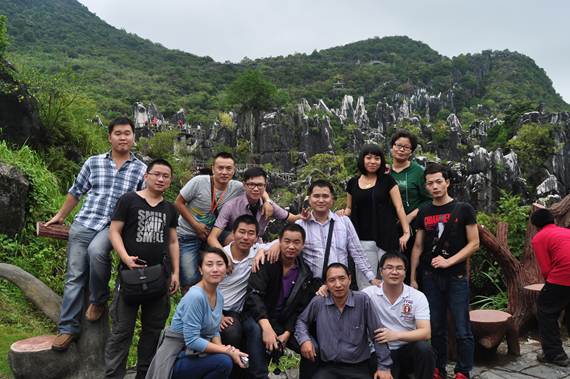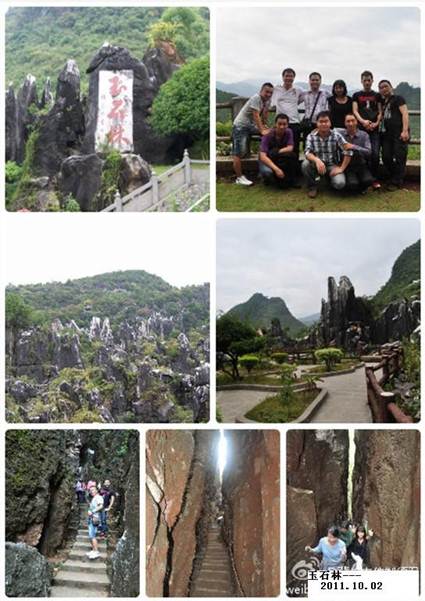 當天下午三點多我們又來到玉石林景區(qū),它之所以叫玉石林是因為山上的石頭屬于玉白色,不同于昆明的花崗巖石林;一路行去,處處石林矗立、石芽裸露、奇峰突兀、石筍石柱狹縫密布;玉石林的小路涉及很科學,在不大的景區(qū)蜿蜒穿插,交錯疊行,可以使游人充分運動,又能從不同角度去欣賞玉石林的特色;大家逢路必走,有坡必上,特別是在“一線天”,累的大汗淋漓,較上午的游姑婆山累多了。。。