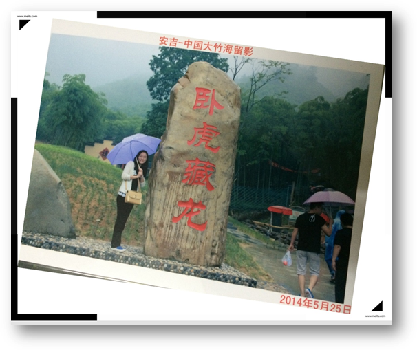 旅行的第二天,我們在據說有大雨的天氣中開始了我們的行程。一路上,雨,忽停忽下,有時還傾盆而下連綿不斷。雖然天公不作美,但我們游玩的心情不減反增,相信在雨中更能體會到大自然的樂趣,為此,我們便來到了電影《一代宗師》的拍攝地點之一------大竹海。既然是這么有意義的地方,當然少不了來一張“全家福”咯。