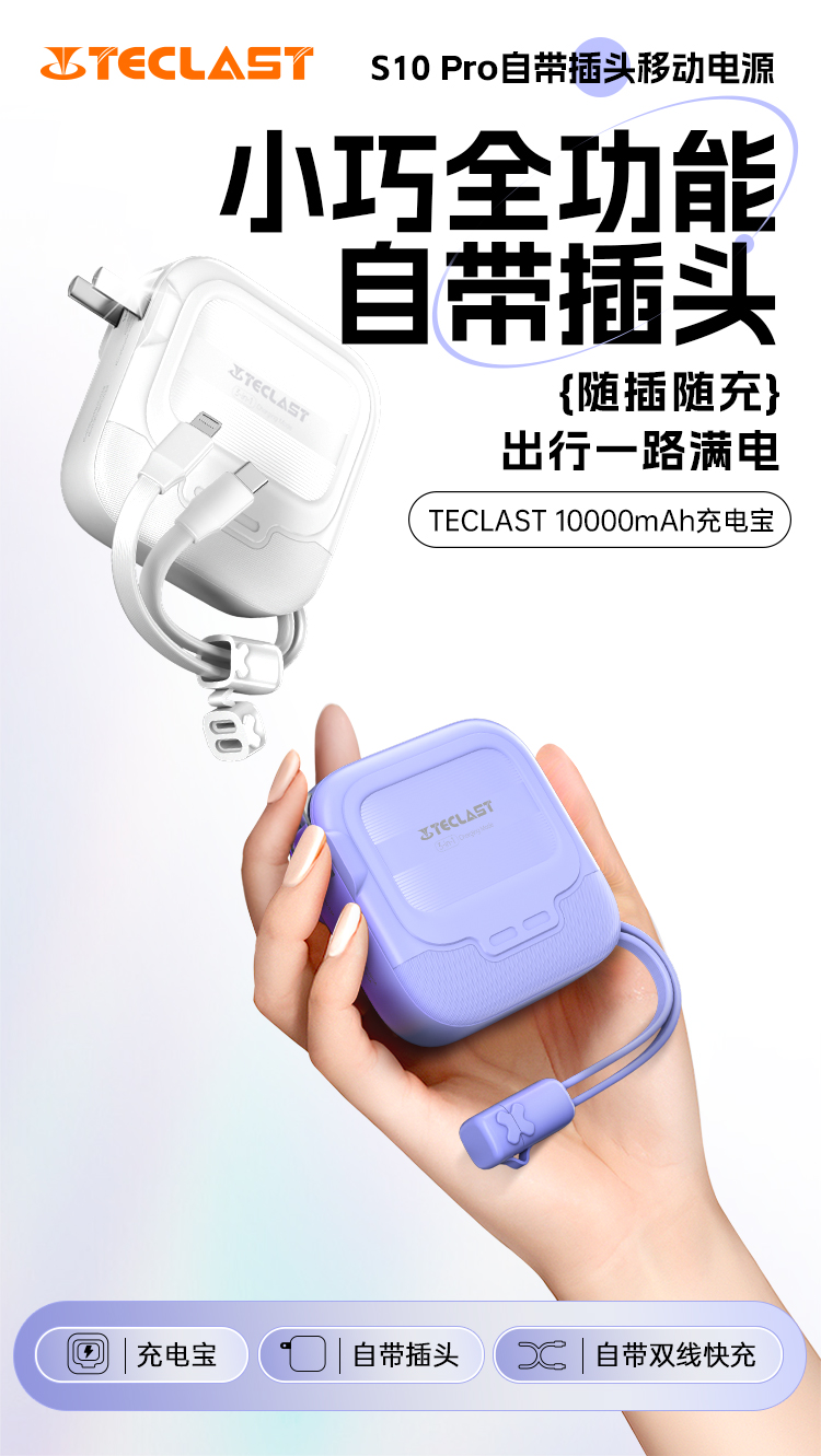 臺(tái)電S10 Pro在設(shè)計(jì)上可謂簡(jiǎn)約而不失時(shí)尚感,提供紫色和白色兩種配色,滿足了不同消費(fèi)者的審美需求。其相對(duì)輕便的重量?jī)H為240克,意味著即使長(zhǎng)時(shí)間攜帶也不會(huì)造成負(fù)擔(dān),這對(duì)于經(jīng)常出行的用戶尤其重要。更加貼心的是,S10 Pro內(nèi)置了USB-C和Lightning線,用戶無(wú)需額外攜帶充電線,提升了使用的便利性。