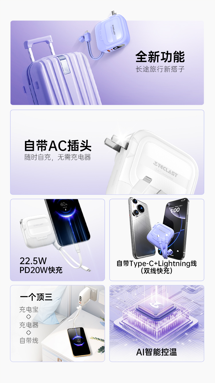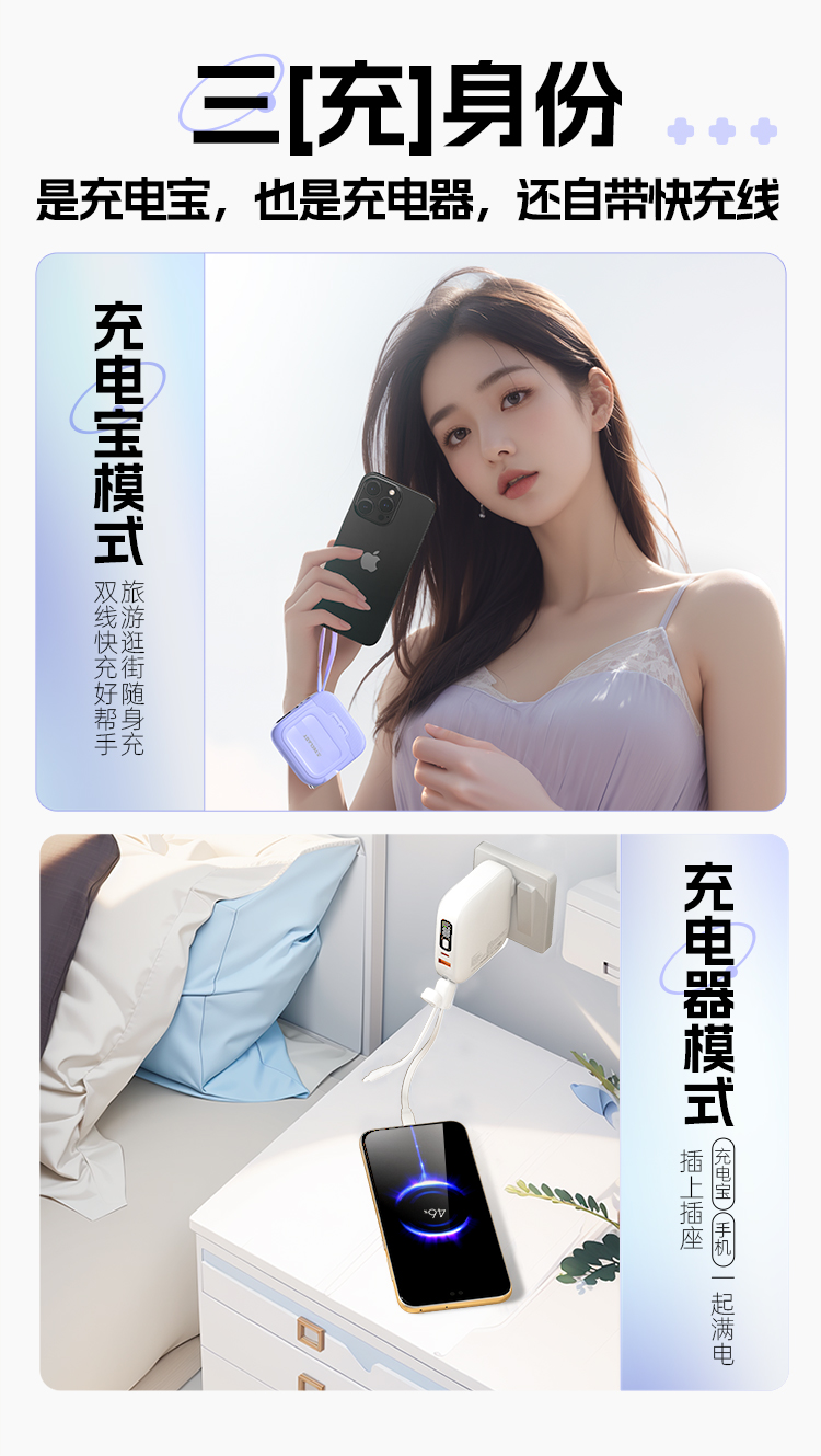 這款充電寶最大的亮點(diǎn)在于其自帶插頭和雙線的設(shè)計(jì)。無(wú)需攜帶額外的充電線和插頭,直接插入插座即可為充電寶本身充電,同時(shí)也能為其他設(shè)備充電。這樣的設(shè)計(jì)極大地簡(jiǎn)化了充電過(guò)程,讓您的和背包行李箱不再被各種充電線纏繞,真正實(shí)現(xiàn)了“一寶在手,充電無(wú)憂”。
