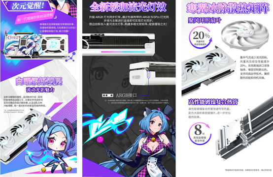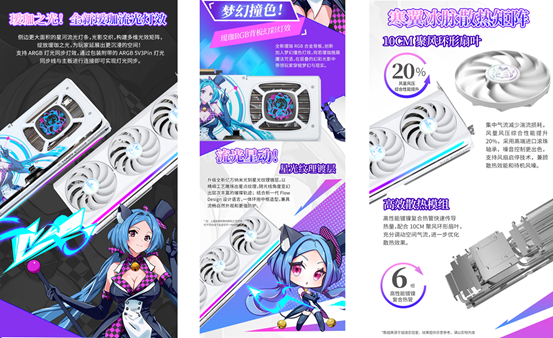 外觀上,它采用新一代Flow Design設(shè)計語言,側(cè)邊星河流光燈條搭配ARGB燈光同步功能,璦珈RGB合金背板創(chuàng)新加入夢幻撞色燈效,層疊幻彩光影為玩家延展出更沉浸的空間氛圍。為應(yīng)對高性能帶來的熱量,顯卡在散熱效能上進行全面升級,3*10CM聚風(fēng)環(huán)形扇葉可集中氣流、減少湍流損耗,進口高端滾珠軸承讓噪音控制更出色,再加上風(fēng)扇啟停技術(shù),完美兼顧散熱效能和待機風(fēng)噪。高效散熱模組能快速傳導(dǎo)熱量,進一步優(yōu)化散熱效果,讓 4K 高畫質(zhì)運行《二重螺旋》時穩(wěn)定在線。