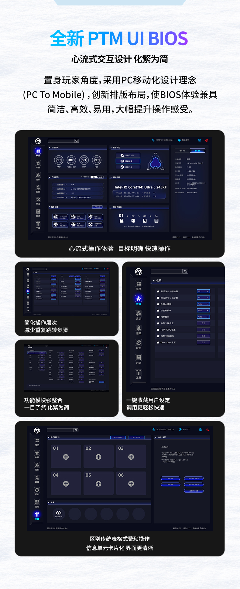 值得一提的是,銘瑄iCraft Z890 Arctic主板的 BIOS 界面經過全面升級,采用了 PTM UI BIOS。全新的 PTM UI BIOS 借鑒手機 APP 的交互邏輯,秉持 PTM 設計理念(PC To Mobile)。它先將所有功能模塊化,再進行聚焦式設計,讓所有交互層級不超過 2 層。手機端風格的卡片式體驗界面,更符合現今用戶的使用習慣,讓復雜的 BIOS 設置變得高效、簡單、易用,即使是新手也能輕松上手。