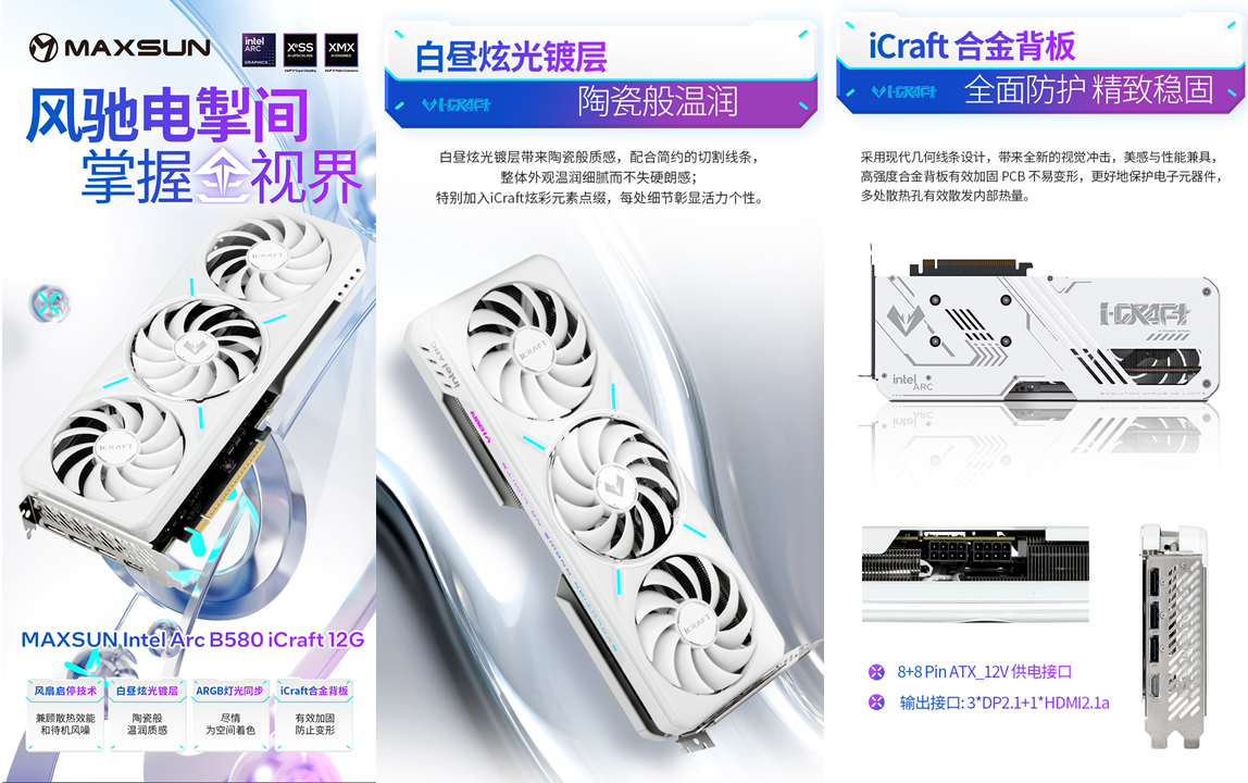 如果說主板是戰場“調度中心”,那MAXSUN Intel Arc B580 iCraft 12G顯卡就是還原《戰地6》戰場質感的“光影畫師”,而且還是位“顏值派畫師”。 白晝炫光白涂層覆蓋的顯卡主體,搭配簡約幾何線條修飾的合金背板,與Z890 Arctic主板放在一起堪稱“白月光組合”,顏值拉滿。