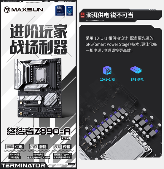 作為這套組合的“性能基石”,銘瑄Terminator Z890-A WIFI主板繼承了終結(jié)者系列的經(jīng)典配色,采用黑色 PCB 與銀色裝甲的搭配,整體風(fēng)格沉穩(wěn)大氣又不失電競范兒。相較于上一代產(chǎn)品,在性能和外觀上都得到了全面升級。這款主板采用了10 + 1 + 1相供電設(shè)計,配備更先進(jìn)的SPS(Smart Power Stage)技術(shù),更佳化每一相電源,電源調(diào)控更高效、更穩(wěn)定。即使在英特爾酷睿 Ultra 7 265K 處理器滿負(fù)荷運(yùn)行場景下,也能持續(xù)提供穩(wěn)定且強(qiáng)勁的電力支持,為 3A 游戲的高幀率運(yùn)行、多任務(wù)的流暢處理筑牢動力根基。