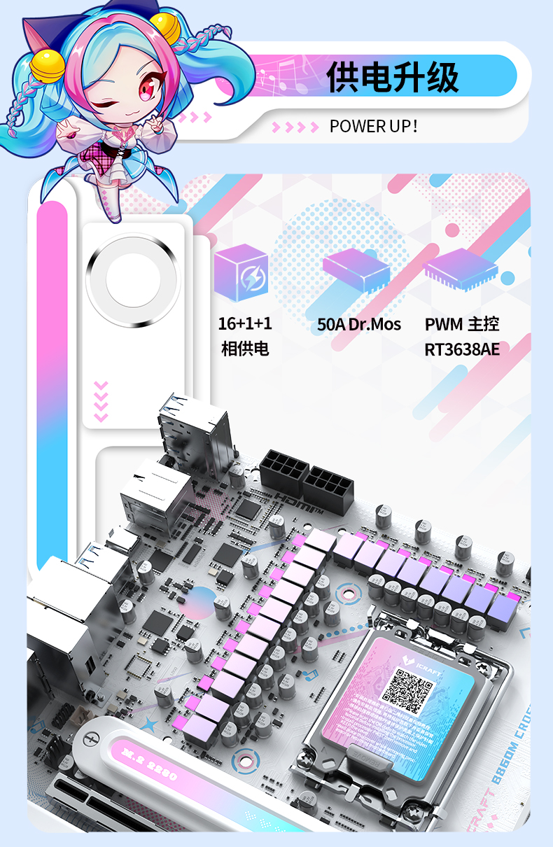 如果說顏值是主板的外在魅力,那供電性能就是釋放處理器性能的核心底氣。銘瑄 iCraft B860M CROSS PRO 主板搭載 16+1+1 相 50A Dr.MOS 供電組合,搭配 RT3638AE PWM 供電控制芯片,為英特爾酷睿 Ultra 200S Plus 系列處理器提供澎湃且穩定的電力輸出,如同為硬件裝上了 “強力心臟”。即便在處理器長時間高負載運行的場景下,也能持續保持電力輸出的平穩性,為 3A 游戲高幀率運行、專業創作多任務流暢處理筑牢堅實的動力根基,讓新處理器的多核性能充分釋放。